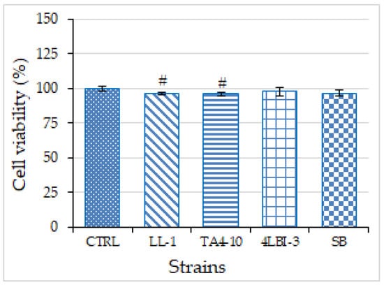 Effect of TA4-10, LL-1, Sb and 4LBI-3 on U937/PMA macrophage cell line viability. U937 cells were seeded in the presence or not (CTRL) of the four selected strains. Following 72 h cell viability was measured by cell counting. # p < 0.05 vs. CTRL (one-way analysis of variance, ANOVA).