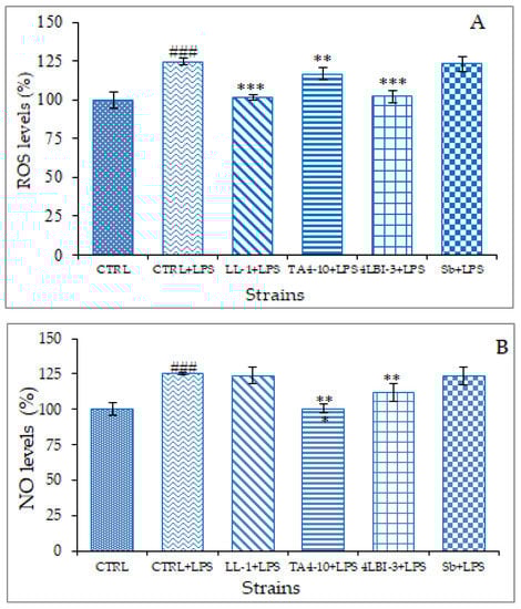 Anti-inflammatory activity of TA4-10, LL-1, Sb and 4LBI-3 strains in U937/PMA macrophage cell line. Anti-inflammatory effect of all four trains has been evaluated by measuring ROS (A) and NO production (B) in LPS-induced macrophage cell line. U937/PMA cells were triggered by 200 ng/mL of LPS in the presence or not (CTRL) of TA4-10, LL-1, Sb and 4LBI-3. Following 24 h ROS and NO levels were quantified. The symbol # means comparison vs. CTRL, whereas the symbol * means comparison vs. CTRL + LPS. ** p< 0.01; ### and *** p < 0.001, (one-way analysis of variance, ANOVA).