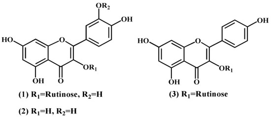 Chemical structures of Rutin (1), quercetin (2), and kaempferol-3-rutinoside (3).