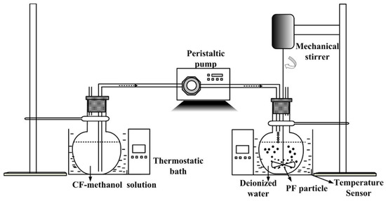 The specific antisolvent equipment is shown in Figure 2. A certain weight of CF as previously stated was weighed and added to methanol by 30.0 mg/mL of TF, and the insoluble residue was filtrated to obtain clear solution. Next, the solution was pumped into deionized water by peristaltic pump under stirring with constant speed. After a while, all solutions were removed by filtration, and the precipitates were obtained and washed thrice using deionized water. The PF was collected after oven drying at 120.0 °C at constant mass.