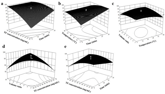 RSM plots—(a) Effect of TF concentration and stirring time; (b) effect of temperature and stirring time; (c) effect of temperature and volume ratio of water and methanol on PF yield; (d) effect of total flavonoids and volume ratio of water and methanol; (e) effect of TF concentration and stirring time on PF purity.