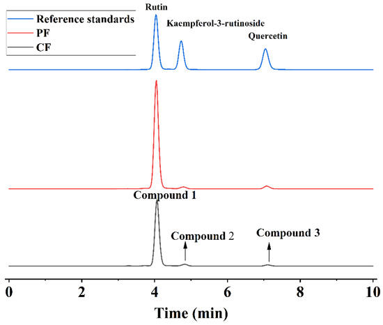 HPLC chromatogram: reference standards of three flavonoids (blue line), the main flavonoids in PF (red line), and CF (black line).