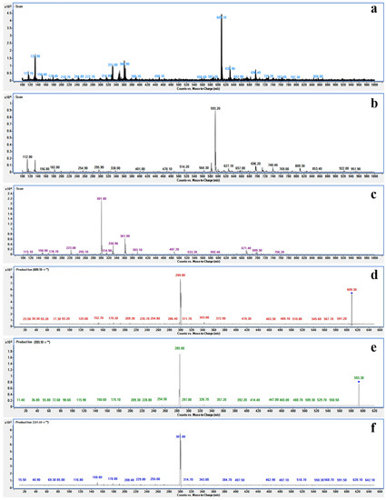 The UPLC-MS/MS chromatograms of three compounds (a–c); MS/MS fragmentation of three compounds (d–f) in negative ion mode.