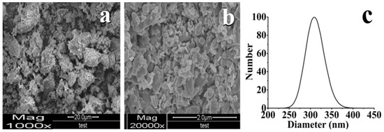 The SEM photos of sample morphology are exhibited in Figure 6. In Figure 6a, CF showed irregular block particles at a diameter of approximately 1250–2470 nm. From Figure 6b, PF morphology showed minimal sphere-like and strip shapes with particle sizes of approximately 250–430 nm, which is a more uniform distribution. This result indicated that the PF obtained by antisolvent reduced in size compared with CF because TF recrystallization was slow after nucleation in water–methanol systems. From Figure 6c, the particle size distribution demonstrated a mean diameter of 309.7 nm, which adapts SEM result. The decrease in particle size may improve the solubility of TF [32,38].