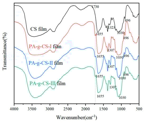 Figure 1 presented the FT-IR spectra for CS and PA-g-CS films. All curves displayed representative bands of amino polysaccharides. The CS film showed characteristic bands around 3450 cm−1 (OH- and NH- stretching in the benzene ring), 2930–2870 cm−1 (C-H stretching), 1655 cm−1 (amide-I, C=O stretching), 1590 cm−1 (amide-II, N-H bending), 1323 cm−1 (amide-III, C-N stretching, residual N-acetyl groups), 1030 cm−1 (C-O-C), and 896 cm−1 (pyranose ring). This finding was consistent with previous reports in the literature [33]. The three conjugates showed a novel band at 1730 cm−1, which was related to C=O group stretching of the saturated ester. This observation indicated the occurrence of graft co-polymerization of PA (-COOH) and CS (-OH), along with the formation of ester linkages. Moreover, it was observed that the bands of the three conjugates in amide-III shifted from 1323 to 1307, with higher peak intensity than that of the CS film. This also confirmed that the grafting reaction occurred in the amino group (-NH2).