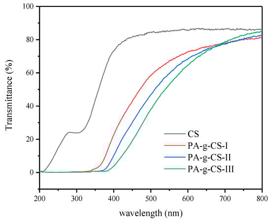 In recent years, scholars have widely emphasized the importance of UV-protective films, since the free radicals produced from light can compromise the food quality [36,37]. As shown in Figure 3, the PA-g-CS film can shield more than 99% of UV rays, as observed in the range of 200–374 nm. The UV transmittance was inversely related to the grafting ratios between 374–400 nm. At 400 nm, PA-g-CS-I, PA-g-CS-II, and PA-g-CS-III showed the highest UV transmittance, with the values of 22.58%, 10.20%, and 3.87%, respectively, at which the transmittance of the CS film was observed to be 73.14%. Hence, our results suggested that the PA-g-CS films could effectively prevent UV light and be used to preserve the packaged food against light-related quality losses. Notably, the PA-g-CS-III film outperformed others in terms of UV-shielding capacity, owing to the formation of more C=O and C=N bonds, along with more benzene rings introduced during the grafting processes [34].