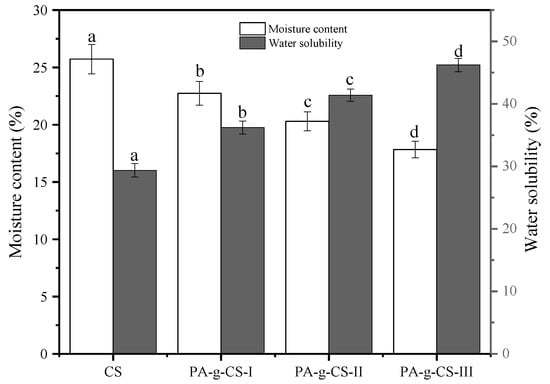 Moisture content and water solubility of the CS and PA-g-CS (I-III) films. Different letters in the same index indicate a significant difference (p < 0.05).