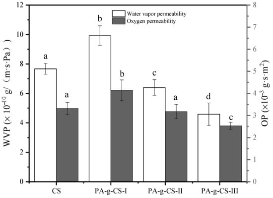 Water vapor permeability and oxygen permeability of the CS and PA-g-CS (I-III) films. Different letters in the same index indicate a significant difference (p < 0.05).