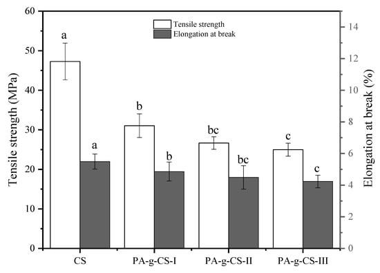 Tensile strength and elongation at break of the CS and PA-g-CS (I-III) films. Different letters in the same index indicate a significant difference (p < 0.05).