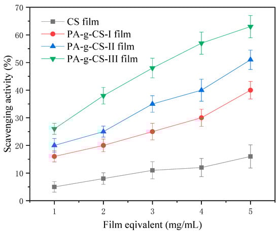 The DPPH assay was employed to examine the antioxidant activity of the various studied films. The reduction in the absorbance at 517 nm was regarded as the determinant of the DPPH radical scavenging capacities of a film. As observed in Figure 7, the weakest DPPH scavenging capacity was observed in the CS film. The antioxidant activity of the CS film was attributable to the reactions of free radicals with the amino (C – 2 position) and hydroxyl groups (C – 3/C – 6 positions) [44]. The DPPH scavenging capacity of the PA-g-CS film was more potent than that of the CS film, which was positively correlated with the grafting degree. The polyphenol–chitosan conjugate was confirmed to exhibit stronger antioxidant activity [45], with PA-g-CS being easier to dissolve, making the relative concentration higher and the ability to scavenge DPPH free radicals stronger.