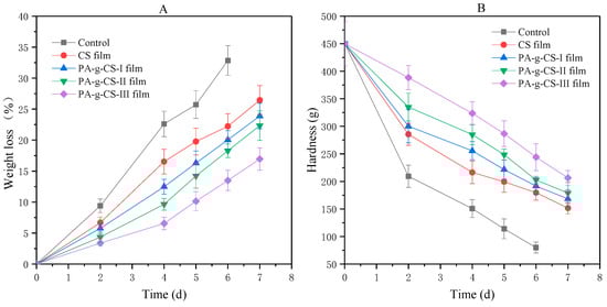 Factors such as water transpiration, respiration consumption, and the leakage of juice often lead to the reduction in the weight of fresh-cut fruits during storage. As shown in Figure 8A, the control group showed the greatest weight loss during storage (p < 0.05). Comparatively, both CS and PA-g-CS film groups exhibited lower weight reductions in the fruit. This might be attributed to a protective barrier established by the films, which could help to limit the gas exchange, while decreasing moisture evaporation and reducing the loss of organic matter. Similar delay in weight loss behavior has been demonstrated in CS-coated pummelos [31], litchis [46], and grapes [47].