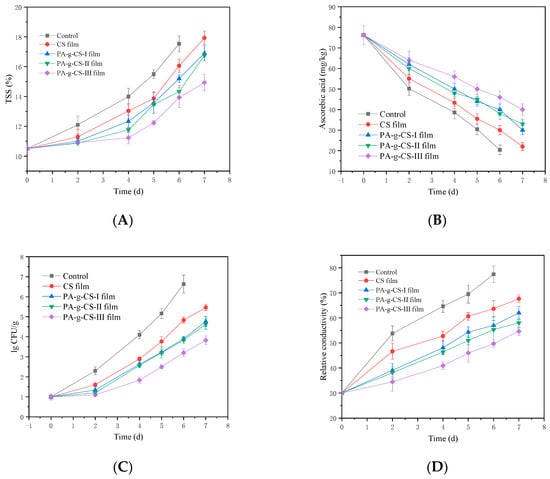 The TSS content is also an important indicator that reflects the fruit flavor quality. As observed in Figure 9A, the TSS of fresh-cut jackfruit showed an upward trend during storage. On the second day, the differences in the TSS value among various film groups were found to be insignificant. After the second day, the TSS of the control group increased rapidly compared to the CS and PA-g-CS film group. The slowest increase in TSS was observed in PA-g-CS-III group. The results indicate that the PA-g-CS-III film could effectively delay the ripening and senescence of jackfruit buds during storage.