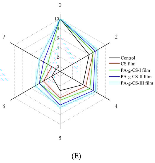 Figure 9C showed the changes in the total bacterial count of fresh-cut jackfruit. During the storage period, the total bacterial count of fresh-cut jackfruit packaged in different films showed an upward trend. The total bacterial count in the control group was significantly higher than in the films group (p < 0.05). The total bacterial count in the CS film group was significantly higher than in the PA-g-CS films group. The total bacterial count in the PA-g-CS films group was negatively correlated with the degree of grafting. A high grafting degree of the PA-g-CS membrane could effectively reduce the colony growth in fresh-cut jackfruit.
