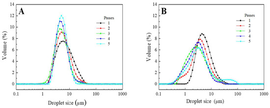 Droplet size of W1/O/W2 multiple emulsions obtained after processing the secondary emulsion at 5 MPa (A) and 20 MPa (B), as a function emulsion passes through the high-pressure homogenizer.