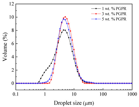 Droplet size distribution of W1/O/W2 multiple emulsions obtained after using 1, 3 and 5 wt.% PGPR for the primary emulsion.
