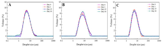 Figure 3 shows the DSD profiles obtained for the W1/O/W2 multiple emulsions for three different O/W ratios when the secondary emulsion is prepared: 10/90 (Figure 3A), 25/75 (Figure 3B) and 40/60 (Figure 3C). Moreover, the droplet stability of the emulsions prepared over storage time was also analyzed. All measurements plotted were carried out in the presence of 1% SDS. The DSD profiles obtained for all double emulsions generated were fairly similar, obtaining a unimodal distribution and the droplet sizes were within 2 and 20–30 µm. Moreover, these DSD profiles remained unaltered as a function of storage time, indicating high stability of the three ratios analyzed (10/90, 25/75 and 40/60) over storage time.