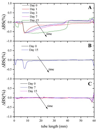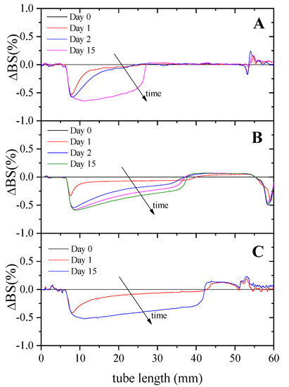 In order to analyze the stability of emulsions against creaming, Figure 4 shows the differential profiles of the backscattering variations (ΔBS%) when samples destabilize as a function of time.