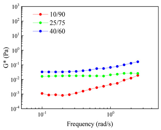 Complex moduli (G*) of multiple emulsions as a function of frequency obtained for three different (W1/O)/W2 ratios for the secondary emulsion: 10/90, 25/75 and 40/60.