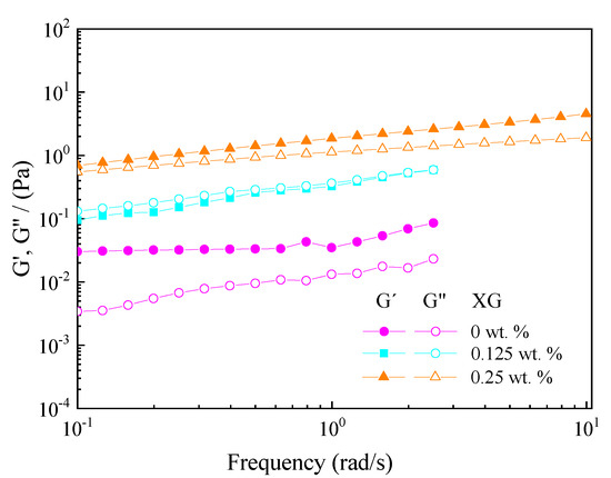 Viscoelastic moduli (G′ and G″) as a function of frequency of W1/O/W2 multiple emulsions obtained at three different xanthan gum (XG) concentrations (0, 0.125 and 0.25 wt.%) obtained the same day emulsion preparation.