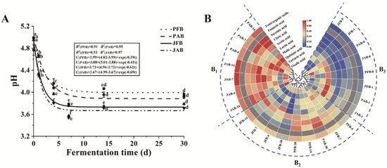 Changes in the pH value (A) and organic acids content (B) of pickled chili pepper based on different fermentation procedures, including PFB, PAB, JFB, and JAB (n = 3). (A) pH value plot: the full lines represent the fitted values by kinetic modelling and the symbols represent the experimental data. Estimated parameters of the kinetic model were shown in the box. Different lowercase letters (a–f) indicated significant differences as a function of fermentation time (p < 0.05). (B) Hierarchical clustering and heatmap visualization of organic acids: the color intensity was based on a normalized scale from a maximum of 1 (red) to a minimum of 0 (blue), which indicated the abundance of the organic acids among high (B1), medium (B2), and low (B3).