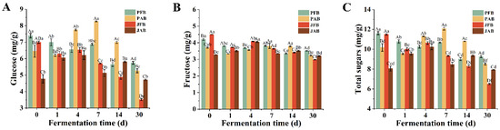 Glucose (A), fructose (B), and total sugars (C) of pickled chili pepper processed by PFB, PAB, JFB, and JAB (n = 3). Different capital letters (A–D) indicate significant differences in different treatments (p < 0.05); different lowercase letters (a–f) indicate significant differences as a function of fermentation time (p < 0.05).