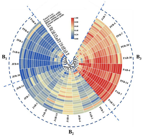 Heatmap visualization of free amino acids of pickled chili pepper processed by PFB, PAB, JFB, and JAB (n = 3). The color intensity was based on a normalized scale from a maximum of 1 (red) to a minimum of 0 (blue), which indicated the abundance of the free amino acids among high (B3), medium (B2), and low (B1).
