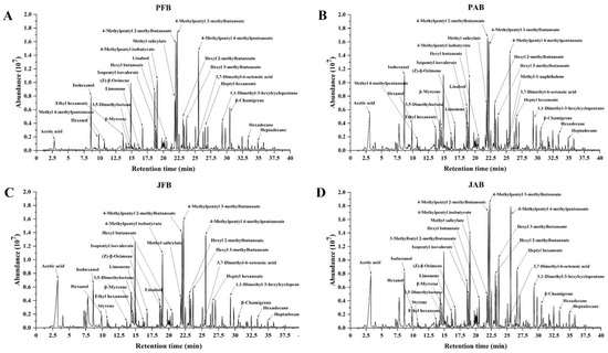 Representative total ion chromatograms of the headspace volatile compounds pickled chili pepper processed by PFB (A), PAB (B), JFB (C), and JAB (D) fermented for 30 days. The most abundant peaks were identified and marked on the chromatograms.