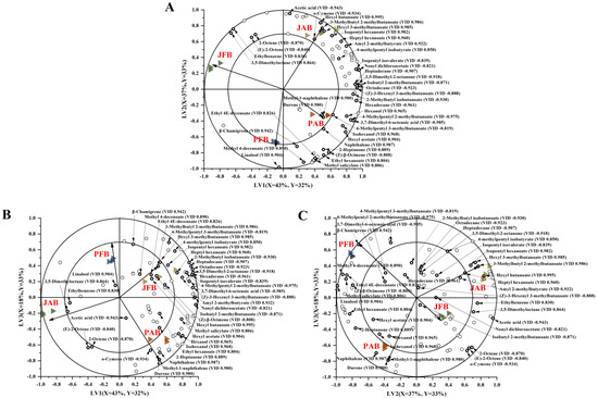 ) for pickled chili peppers of different fermentation procedures (n = 3). The X− and Y−variance explained by LV1 and LV2 (A), LV1 and LV3 (B), LV2 and LV3 (C) were indicated in the respective axes. The open circles show different volatiles. The discriminant volatiles with absolute VID values above 0.800 were named and marked in bold.
