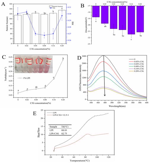 Particle size and PDI (A), zeta potential (B), and turbidity (C) of LPI-C3G complexes at different C3G concentrations; ANS-fluorescence intensity (D) and thermal denaturation temperatures (E) of LPI-C3G complexes (0.5 mg/mL LPI). Different letters represent significant differences (p < 0.05).