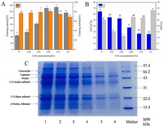 Foaming capacity and stability (A), emulsifying activity index (EAI) and emulsion stability index (ESI) (B), and SDS-PAGE profiles (C) of LPI-C3G complexes at different C3G concentrations. Lanes 1, 2, 3, 4, 5, and 6 represent C3G concentrations of 0, 0.02%, 0.04%, 0.08%, 0.16%, and 0.2%, respectively. Different letters represent significant differences (p < 0.05).