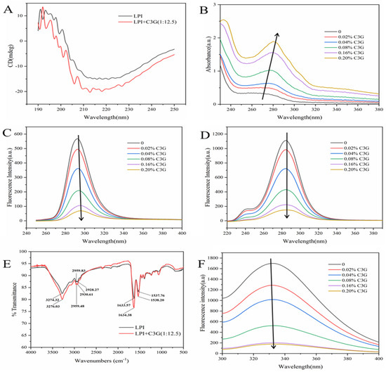 UV–vis spectra are often used to investigate structural changes and intermolecular interactions []. When the concentration of C3G increased from 0% to 0.2%, the absorbance of LPI enhanced and the maximum absorption peak shifted from 268 nm to 280 nm (Figure 3B), which might be the interaction between the aromatic residues of LPI and C3G contributing to the transition of the more hydrophobic microenvironment of the aromatic amino acid residues in proteins []. Similar results were reported between black soybean protein isolate with C3G, which showed a very small redshift from 272 nm to 279 nm [].