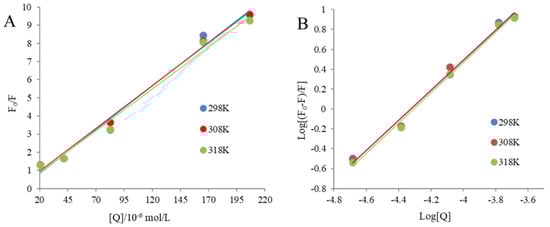 Generally, the fluorescence-quenching mechanism includes dynamic and static []. With the increase in temperature, the dynamic quenching constant increases, while the static quenching constant decreases, which can be used to distinguish the quenching types [,].