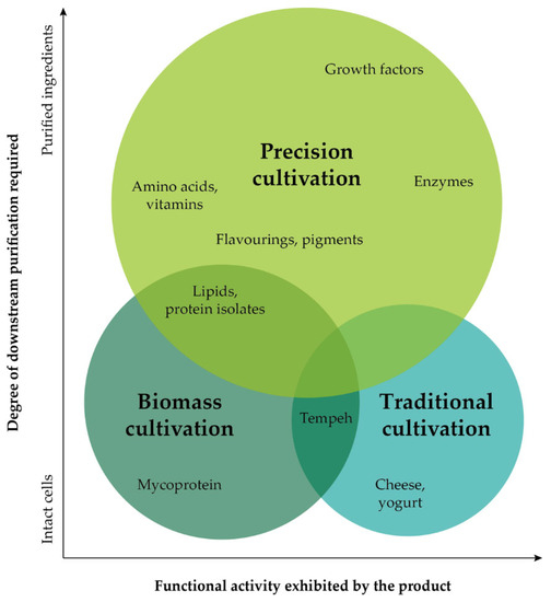 As seen from Table 1 and Figure 1, cultivation technology provides the possibility of producing a huge diversity of products, such as meat, dairy and egg replacements, seafood, fats and oils, infant food, pet food, and many more, as well as enhancing plant-based products across these food categories. Traditional methods have been practiced for thousands of years to create foods such as wine and cheese. Using live microbes, they can modify plant-based components, enhancing their taste, nutritional value and texture. The power of microorganisms possessing high amounts of protein to grow quickly is exploited by biomass cultivation to effectively generate a lot of protein fast. It is then possible to use the microbial biomass as a food ingredient, either with a minimal degree of processing or with its cells intact. The purpose of precision cultivation is to produce specific functional ingredients by using microbes as factories for generating the desired component. Compared to primary protein, these ingredients are utilized in much smaller quantities but higher purities because of their powerful influence on the sensory and functional characteristics of the final product.