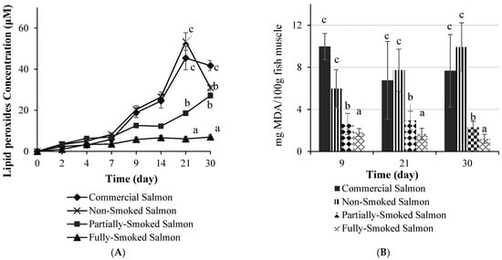 (A) Lipid hydroperoxide content in commercial and FN non-smoked and FN half-smoked and fully smoked FN salmon versus storage time (days); (B) Malonaldehyde (MDA) content in commercial and FN non-smoked salmon and FN half-smoked and fully smoked FN salmon during storage time (days). Values represent mean ± SD (n = 3). Superscripts with different alphabets (a–c) are significantly different (p < 0.05).