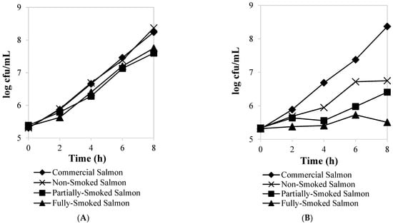 The growth curves of Listeria innocua over 8 h obtained in the presence of water and hexane extracts of non-smoked and FN smoked fish are shown in Figure 2. Listeria innocua growth was not mitigated by exposure to the water extract (Figure 2A) but did show significant (p < 0.05) inhibition to the hexane extracts (Figure 2B) collected from only FN fully smoked salmon samples. The time defining a lag phase for L. innocua growth was approximately 3 h, 4 h, and >8 h, respectively, for commercial smoked, half-smoked, and fully smoked hexane extracts. This corresponded to 19.4 ± 3.55 and 23.4 ± 2.20 percent of growth inhibition for the hexane extracts derived from the commercial smoked and FN half-smoked salmon, respectively. For interest, the hexane extracts collected from the fully smoked salmon samples produced the highest suppression (34.2 ± 0.5%), which was attributed to the prolonged lag phase.