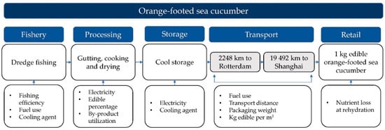 Flowchart of modelled production chain for orange-footed sea cucumber (Cucumaria frondosa) between cradle and retail gate (People’s Republic of China).