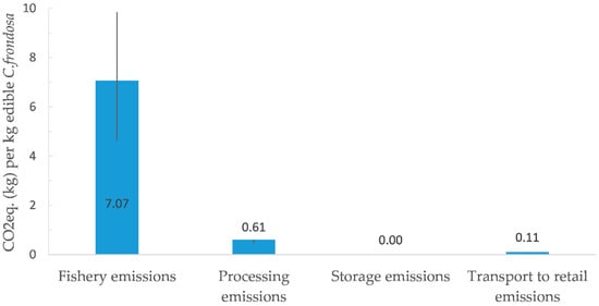 Estimated carbon dioxide equivalent (CO2eq.) emissions for orange-footed sea cucumber (Cucumaria frondosa) at the fishery-, production- (cooking and drying), storing-, and transport stage. The error bars represent the minimum and maximum estimates.