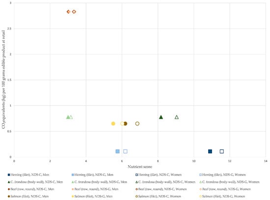 Nutrient density score (NDS) C and G, adapted from [21], for men and women aged 31–60 and compared with the carbon dioxide equivalent (CO2eq.) emissions between cradle (farm/fishery) and retail. CO2eq. emissions for herring (Clupea harengus) and salmon (Salmo salar) are adapted from [48], emissions for beef (Norwegian Red cattle (dual purpose cattle)) are adopted from [21,66], and emissions from orange-footed sea cucumber (Cucumaria frondosa) are from this article. NDS-C and G score food products according to their nutrient composition; however, NDS-G caps the score of nutrients which surpasses 100% of the daily recommended intake. The nutrients for herring, salmon and beef are adopted from [38] and shown in Table A2. Both the nutrient density score and the CO2eq. emissions are calculated per 100 g of edible product.