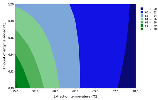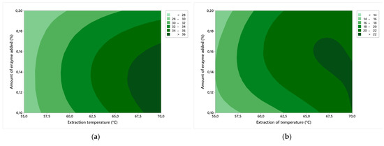 In Figure 3a, we can observe the influence of the contour effects of factors A and B on the melting point of the gelatin gel. Herein, with a lower amount of enzyme added and at a lower extraction temperature, the gelatin fraction with a lower melting point of the gel is extracted. This is related to the strength of the gel, because the higher the strength of the gel, the higher the melting point and viscosity. Therefore, in experiments no. 3 and 6, wherein the highest gel strength was measured (409 ± 6 and 439 ± 6 Bloom), the melting point was also the highest. Values were 37 ± 1 °C for exp. no. 3 and 37 ± 2 °C for exp. no. 6. On the contrary, the worst gel strength was found in exp. no. 7 (25 ± 1 Bloom), and at the same time, the lowest melting point was measured in this experiment, 28 ± 1 °C.