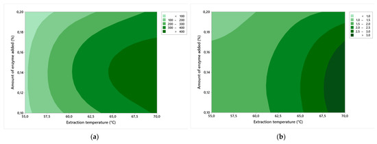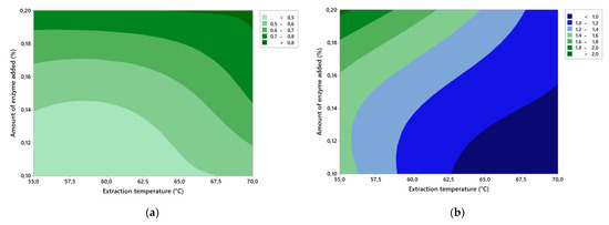 In Figure 4a, we can see a contour graph of the effects of factors A and B on the ash content. It can be seen from the figure that, as the amount of added enzyme increases and the extraction temperature increases, so does the amount of ash content in the gelatins. The highest value of the ash content was found with 0.20% enzyme and extraction temperature of 70.0 °C, and the value was 0.81 ± 0.02%.