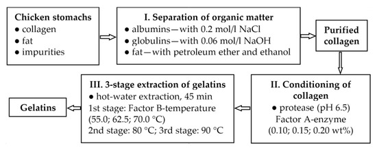 Gelatin of types A and B is produced in industrial practice. The presented study deals with the extraction of gelatin from poultry stomachs after previous collagen enzyme conditioning. A microbial endopeptidase Protamex® provides the partial denaturation of the quaternary structure of collagen. Under suitable conditions during the conditioning process (time, temperature, amount of enzyme) covalent lysine–aldehyde-based bonds (Schiff bases) between individual tropocollagen molecules are cleaved. During processing at room temperature (22.0 ± 1.5 °C), the unwanted cleavage of peptide bonds is avoided. Before the hot-water extraction of gelatin (thermal denaturation of collagen), the enzyme is removed by washing the conditioned collagen with water. This processing step minimizes the hydrolysis of peptide bonds in individual chains of tropocollagen molecules during gelatin extraction at higher temperatures, which would result in lowering the molecular weight of the peptide chains of the prepared gelatin, thus affecting the gelling properties and viscosity of the gelatin. This innovative approach turns out to be the most suitable method of gelatin production in terms of saving time and energy; this method is also environmentally friendly [23].