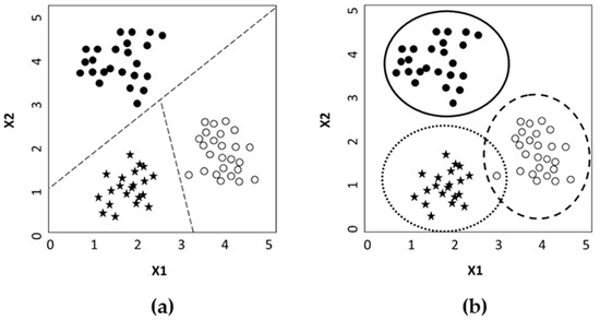 The definition of “cluster analysis” or “clustering” encompasses the techniques which split a set of samples (observations) into several groups or clusters. The outcome is usually represented as a vector of data, or a point (scatter) in a multidimensional space [33]. Clustering falls in the general category of unsupervised pattern recognition and numerical and mathematical taxonomy [33,34]. Natural grouping of data takes place based on some inherent similarity, as clustering is performed without any group labels, and this justifies the unsupervised pattern recognition [33,35]. Furthermore, it takes place based on similarities of the samples within the same group and others in different groups. Therefore, homogeneity is dominant within the same groups [34]. In practice, the most common approach to define similarity is the distance among the patterns; by lowering the distance (e.g., Euclidean distance which is a well-used dissimilarity measure) between the two objects, higher similarity and vice versa will be obtained [35,36].