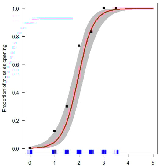 Black squares are averages. y-axis values represent the fraction of mussels open (i.e., 0 = all closed; 1 = all open). The blue rug lines indicate datapoints along the time axis. Model fit is shown in red, with a 2SE (SE = Standard error) confidence interval for model fit shaded gray.