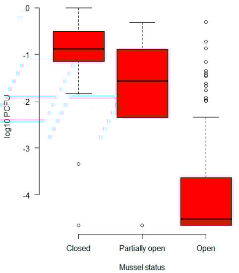Whether or not a mussel is fully open is highly correlated with the proportion PCFU (see Section 2.5 of E. coli being cultivable from that mussel, but alone it explains only about 40% of the variance in the proportion of bacteria being viable after steaming. Including the starting concentration (mean cfu/g in samples from the same batch taken before steaming) as an explanatory variable was not significant, suggesting that at these concentrations the survival rate of bacteria was independent of concentration. See Figure 2. We see a strong reduction in average bacterial concentrations as shells open, but also that even some opened shells retain fairly high bacterial concentrations.