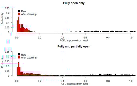 Simulated doses of E. coli in a meal size consisting of 20 randomly drawn open mussels (top panel) as a proportion of original (un-steamed) contamination (Equation (2)). The red bars are a histogram of such meals consisting of mussels steamed to opening, compared to the load from a similar number of raw shells (black bars). The risk is markedly higher if partially opened mussels are included in the meal at the same frequency they were found in this experiment (bottom panel).