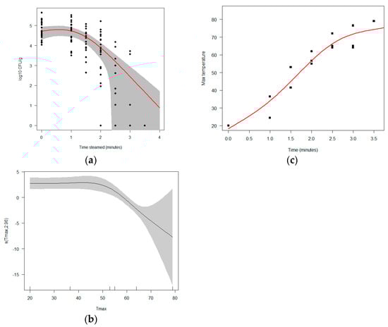 (a) Log10 bacterial concentrations of E. coli as a function of steaming times. The red line gives the best model for inactivation by steaming, with the 2SE confidence interval in gray. (b) Maximum temperature registered on loggers glued inside mussel shells as a function of steaming time. (c) The effect of maximum temperature on viable bacterial concentration (see equations in Section 2.5). We see that it suggests inactivation from a threshold value a little over 55 °C.