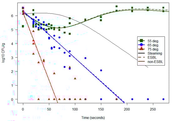 The survival of indicator and ESBL E. coli followed indistinguishable trajectories under heat treatment, indicating that thermal inactivation curves for E. coli can be used for risk exposure models of resistant isolates, as have been conducted in a recent risk exposure study of ground beef [], which used the thermal inactivation curve in E. coli O157:H7 for hamburgers []. Nevertheless, the use of available data needs to be carefully assessed as the different food matrixes and food preparations will have impact of the survival of the specific agent under study [].