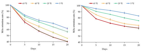 3.3. Thermal Degradation of MAs at Different Temperatures