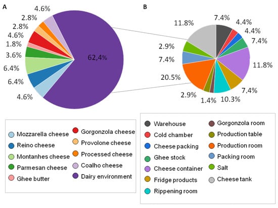 Percentage of filamentous fungi isolated from spoiled dairy products (A) and dairy processing environment, equipment, and tools (B).