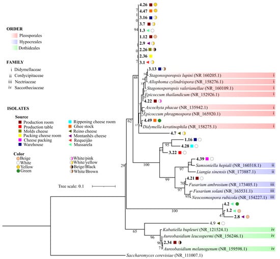 It was not possible to identify 24 sequenced isolates, and eight of them had no similarity with any of the ITS reference sequences. However, 11 had query coverage and percent identity above 95% with three species of different genera: Epicoccum phragmospora, Didymella keratinophila, and Ascochyta phacae, all belonging to the Pleosporales order, and Didymellaceae family. An inferred phylogeny, using the unidentified isolates and reference sequences with greater similarity from the NCBI database, showed that these 11 isolates; the fungi type; two other isolates with similarity to other species, but of the same order and family (4.22 and 3.13); and one with no similarity to any reference sequence (4.7) clustered together. However, no pattern in the source of isolation and fungal color was observed (Figure 3). More information about these isolates is described in the Supplementary Table S1.